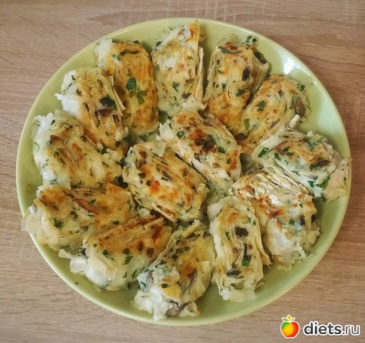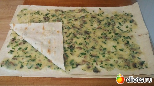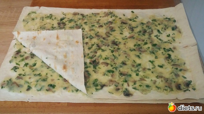 Разделить пюре на две части. Промазать лист лаваша половиной картофельного пюре, накрыть вторым листом лаваша, промазать второй половиной пюре.