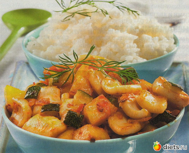 3 В сковороде разогреть растительное масло и обжарить по очереди кальмары и овощи (каждый вид по отдельности).