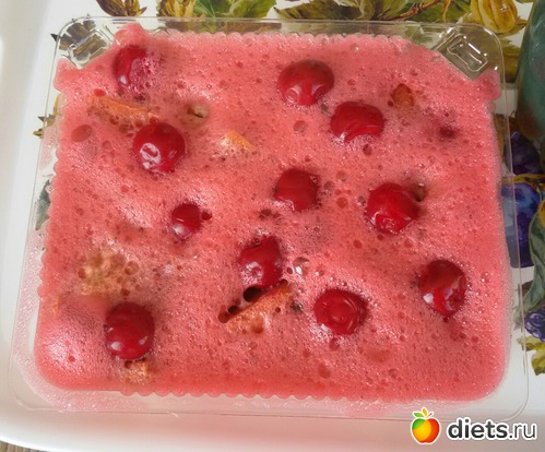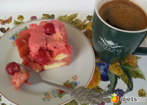 Бисквит: 4 яйца, 25 гр кукурузного крахмала, сахзам. Желтки, крахмал и сахзам смешать. Белки взбить до пиков и вмешать в массу. Выпекать минут 15 при 180°.