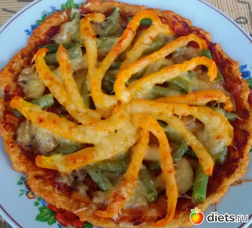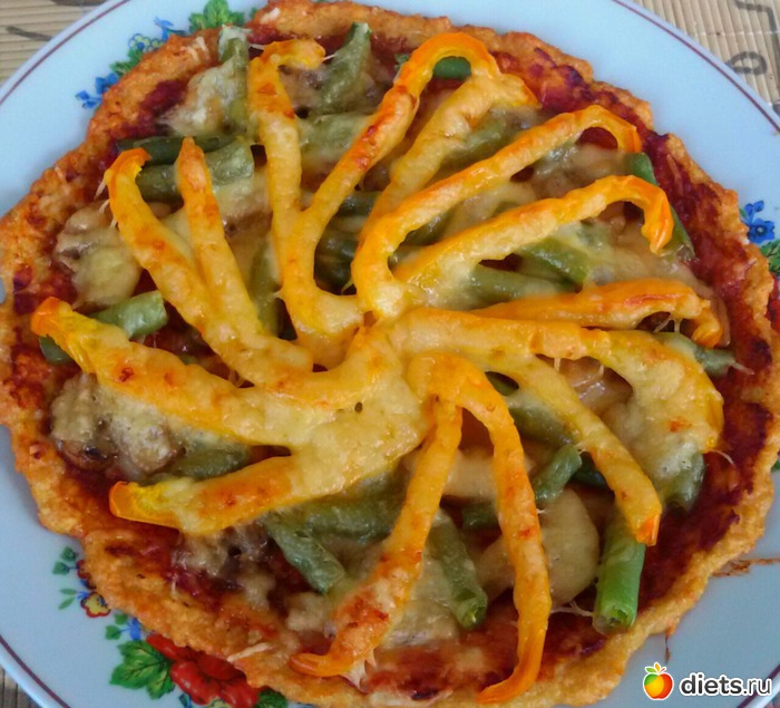 Основа: куриный фарш+яйцо+ложка отрубей ( у меня овсяные были). Сформировать лепёшку и в духовку до полуготовности. Затем томатной пастой смазать, любые овощи и сыр. Запечь. Вкусно и сытно!