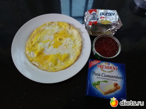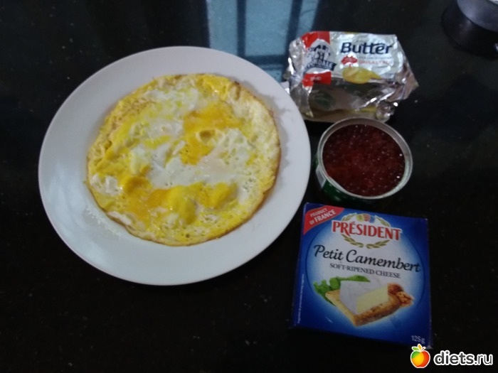 Сыр вместо хлеба, масло, икра и два яйца жаренных на слив.масле.