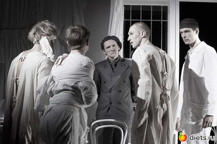 Перед спектаклем, еще в гардеробе пальто у вас принимают гардеробщицы в медицинских халатах. Этим, как бы окунают нас в больничные дела. Декорации - это тоже больница. Все стерильно белое - и столы и стулья и пододеяльники - стены. Немного не по себе, но постепенно это все отодвигается назад, когда завораживает игра актеров. Алексей Вертков (Воланд) очень точно передал этот прекрасный, пленительный и вместе с тем зловещий образ. Это властный господин, его загадочность и обаяние - все это сыграно Вертковым настолько верно и прямо, что захватывает дух.