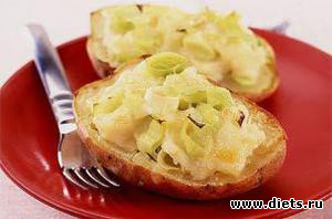 Разрежьте картофель пополам, вдоль выскоблите большую часть мякоти и смешайте с луком-пореем, майонезом, приправьте Вустерширским соусом. И нафаршируйте картофель.