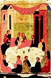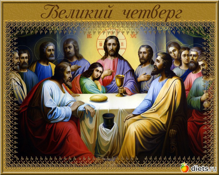 Вечером того дня Иисус Христос, зная, что Он будет предан в эту ночь, пришел с двенадцатью апостолами Своими в приготовленную горницу. Когда все возлегли за стол, Иисус Христос сказал: "очень желал Я есть с вами эту Пасху прежде Моего страдания, потому что, говорю вам, уже не буду есть ее, пока она не совершится в Царствии Божием".