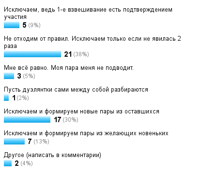 на 1-м взвешивании и не выходит на связь, стоит ли формировать новые пары? Или пусть оставшиеся сражаются в одиночку? Ведь напарница может так и не объявиться.
