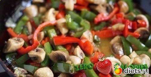1. Чистим и моем овощи. Обжариваем лук на сковороде, смазанной каплей масла. Добавляем крупно нарезанные грибы.