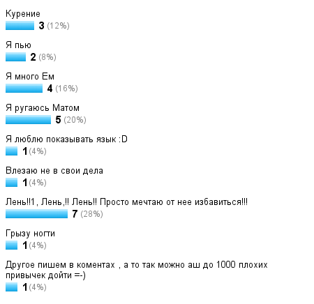 Другое пишем в коментах , а то так можно аш до 1000 плохих привычек дойти =-)