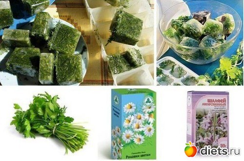 Понадобится: трава шалфея, цветки ромашки (купить в аптеке), петрушка (можете выращивать и дома в горшочке даже зимой). Петрушку можно и сушеную. * Все это взять по 1-2 ч. ложки на стакан горячей воды. * Настаивать примерно 2 часа. * Залить в формочку для льда и в морозильник! * Утром и вечером протирать кусочком льда кожу вокруг глаз. * Цветочная водичка должна впитаться в кожу, не умывайтесь и не вытирайтесь после процедуры!! Сразу после нанесения не пугайтесь, что синяки будут казаться еще темнее, это связано с тем, что кожа краснеет от холода. Через пару минут все придет в норму. Вы совсем забудете про консилеры и корректоры.