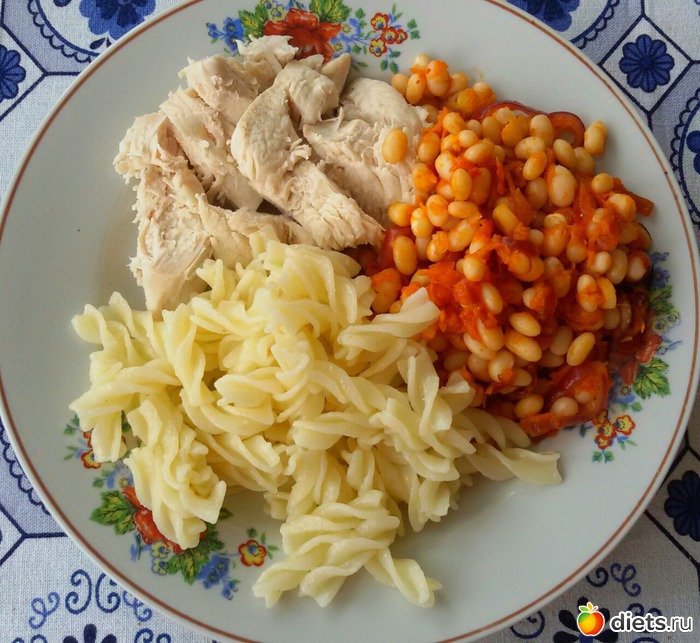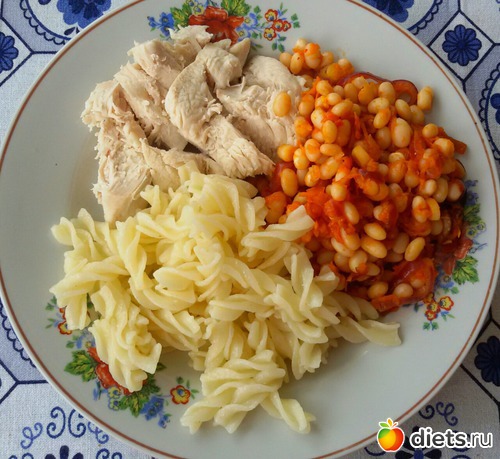 Макарошки, филе куриное отварное, фасоль тушёная. Танюша, супчик твой вспоминала, но взяла и потушила фасольку.