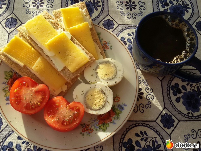 Яйцо, помидор, хлебцы с маслом и сыром, кофе. И солнышко!