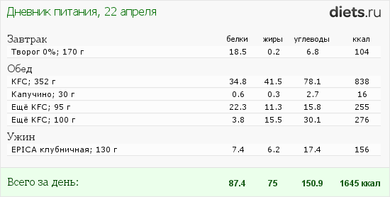 Сегодня прогуливала пару в KFC и взяла побольше, чтобы там подольше посидеть (оценка уже стоит, так что посещение по желанию). Понимала что набираю на дневную норму, думала что больше есть не буду. Но... Как всегда только всё хорошо появляются проблемы откуда не ждёшь. Короче провисела час на телефоне, он выключался а в KFC есть розетки. Чтобы там дальше сидеть, взяла ещё... Не очень умно конечно. Это было скорее от нервов. Заказ делала как в тумане не прекращая разборки. В итоге перебор с калорийностью. Никто мне не виноват...