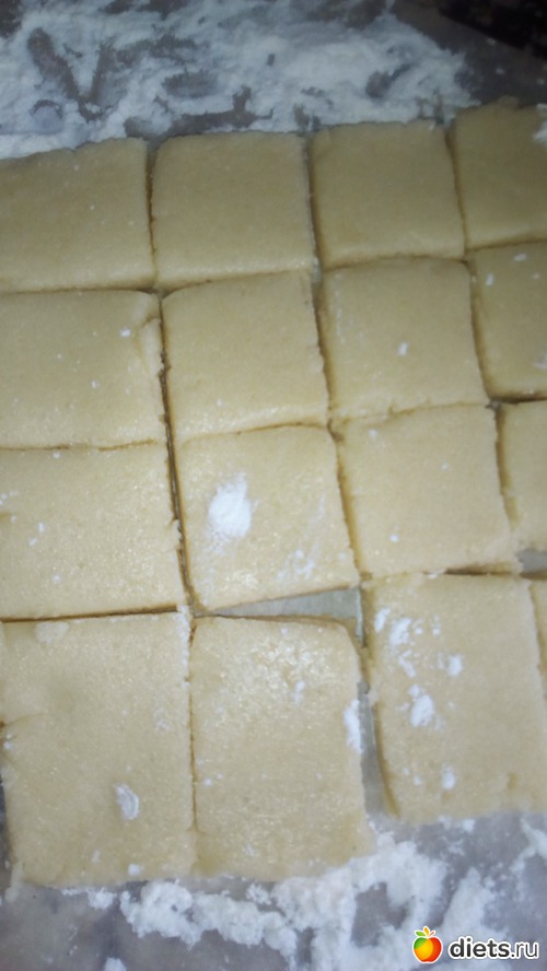 Лист пергаментной бумаги посыпьте мукой. Раскатайте на нём тесто, толщиной не менее 1 см. Переложите вместе с бумагой на противень. Разрежьте тесто на небольшие квадратики. Или можете сделать фигурное печенье — всеразличными формочками!
