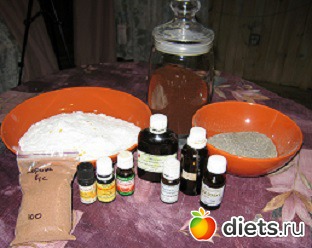 основной ингредиент - молотый кофе, раньше брала спитую гущу, теперь перешла на "неиспользованный" пачка 240 гр, цена вопроса 60 гривен, корица, 50 гр, соль морская, молотая на кофемолке...2 крышечки этой самой кофемолки, ламинария (сушеные водоросли), те же 2 крышечки молотых, дальше пошли масла: зародышей пшеницы, зеленого кофе, ЭМ грейпа, пачули, пару капель витамин Е в масле (я его везде пихаю )))