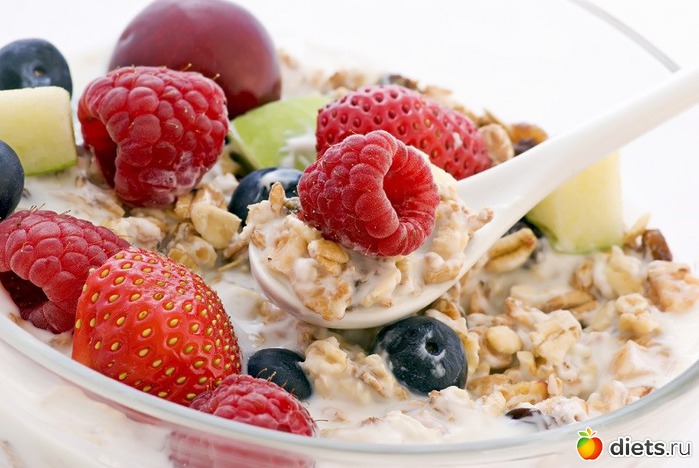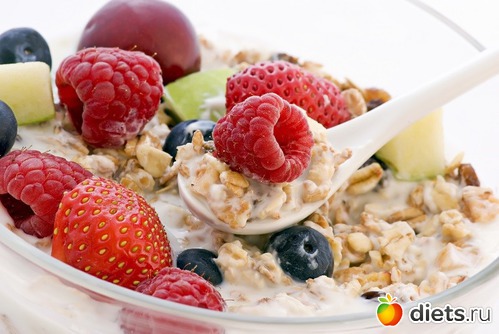 Из овсяных хлопьев следует сварить кашу на воде с небольшим количеством соли, и, распределив ее на весь день, есть вместе с овощами и фруктами.