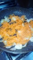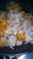 На сковороде под крышкой тушим лук и морковь с небольшим количеством подсолнечного масла до полуготовности. Добавляем куриную грудку, продолжаем тушить.
