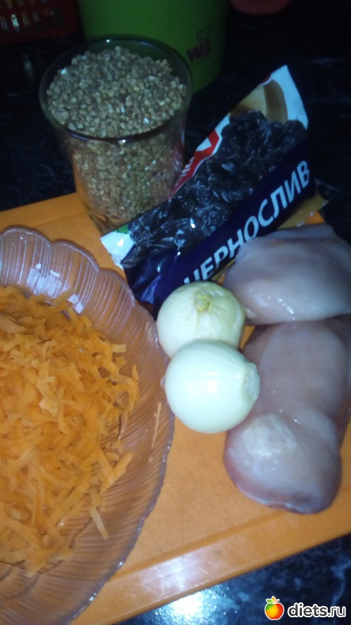 Шинкуем мелко лук. Натираем на терке морковь. Чернослив разрезаем на 2-3 части, чтобы кусочков было много
