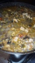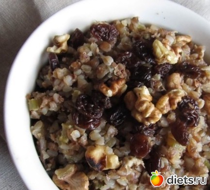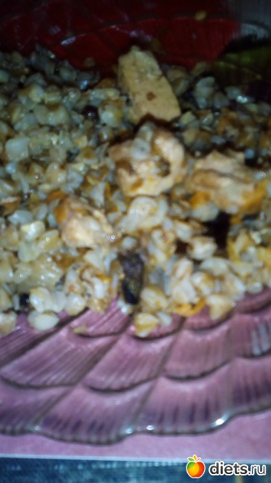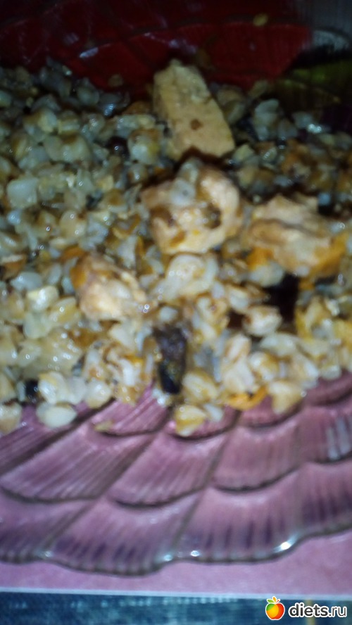 Добавляем к мясу порезанный чернослив, перемешиваем и тушим 2-3 минуты, чтобы чернослив пропитался вкусом и отдал аромат мясу. Добавляем воду, промытую гречку и готовим под крышкой до полного выпаривания воды и до готовности гречки.