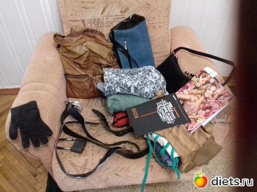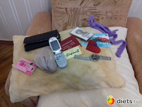 Две подушки, поясок вязанный, колготки, старые часы, кошелек, открыточка из Анапы, старое удостоверение, мой старый любимый телефончик, масло розы из Болгарии, этикетка, касета и стеклянное сердце не знаю от кого и для чего...