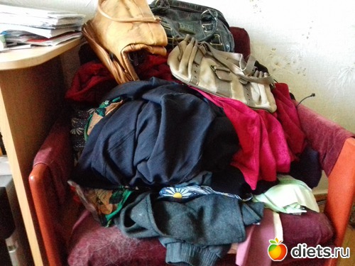 Добралась до своего шкафа. Сверху 3 старые сумки, ниже 22 предмета из одежды. Девочки, я прямо сама собой горжусь, что наконец-то смогла их выкинуть, а не отложить на черный день!!! Надеюсь, теперь у меня впереди будут только светлые дни!