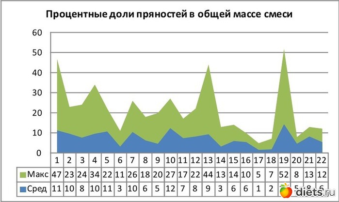 Пики рецептурных максимумов (см.зеленую часть второй диаграммы) приходятся в этой восьмерке, прежде всего, на куркуму, кориандр и кардамон.