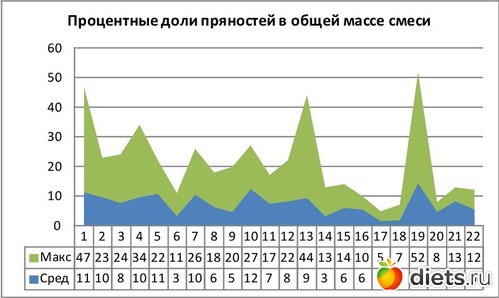 Количество ингредиентов в одной рецептуре: от 6 до 33 со средним значением 13