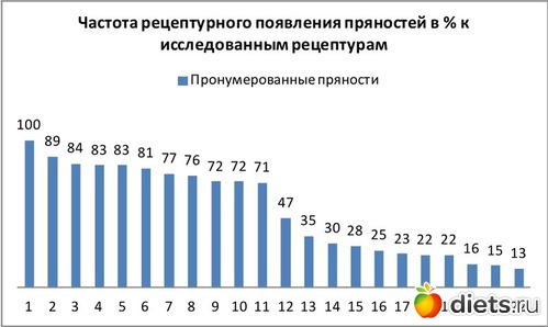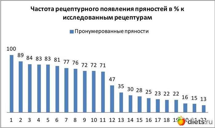 1.корица - 100 %; 2. имбирь - 89%; 3. мускатный орех - 84%; 4. куркума - 83%; 5. черный перец - 83%; 6. гвоздика - 81%; 7. кориандр - 77%; 8. душистый перец - 76%; 9. жгучий перец - 72%; 10. зеленый кардамон -72%; 11. кумин - 72%; 12. мускатный цвет - 47%; 13. роза - 35%; 14. бадьян - 30%; 15. белый перец - 28%; 16. фенхель - 25%; 17. шафран - 23%; 18. лаванда - 22%; 19. сладкая паприка - 22%; 20. галангал 16%; 21. горчица - 15%; 22. райские зерна - 13%.