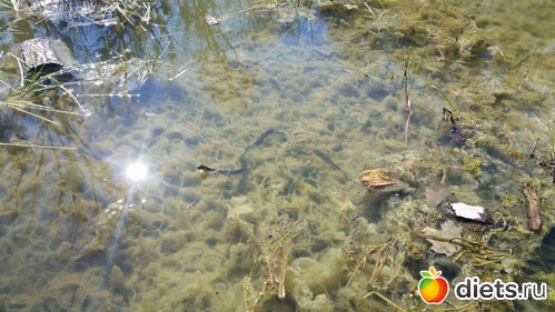 Пруд недавно вырыли и обложили камнями, буквально в прошлом году, мы видели эти работы. А сейчас в нем уже кипит жизнь: На камнях грелась семейка ужей, сначала немного испугавшая нас, когда мы на них чуть не наступили