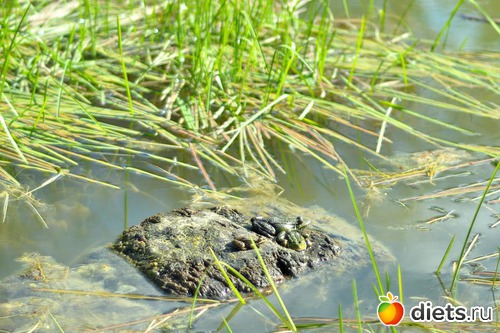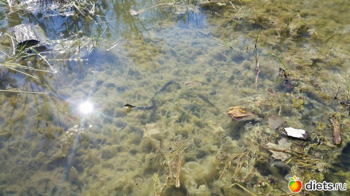 Пруд недавно вырыли и обложили камнями, буквально в прошлом году, мы видели эти работы. А сейчас в нем уже кипит жизнь: На камнях грелась семейка ужей, сначала немного испугавшая нас, когда мы на них чуть не наступили