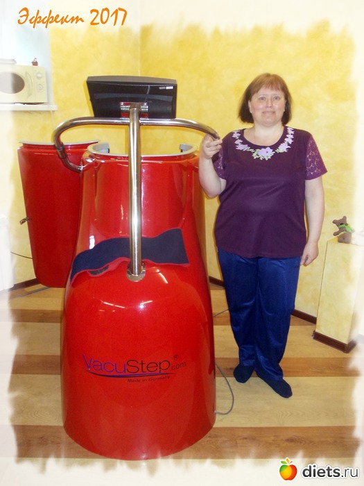 Красный аппарат - это вакустеп, который объединяет движение и вакуум. На тебя одевают специальную юбочку, и ты крутишь педали согласно установленной тренером программе. То быстрее, то медленнее, потому что крутить становится тяжелее. При этом нужно следить за пульсом, чтобы он был не выше 120. При занятиях на вакустепе происходит вакуумный массаж, идет воздействие на подкожную жировую клетчатку. Ускоряется обмен веществ на ляжках, заднице и животе, лимфоотток. Через 30 минут вакустепа, ты потеешь как верблюд, рекомендуется испить воды. Как результат - уменьшаются и вес и объемы.