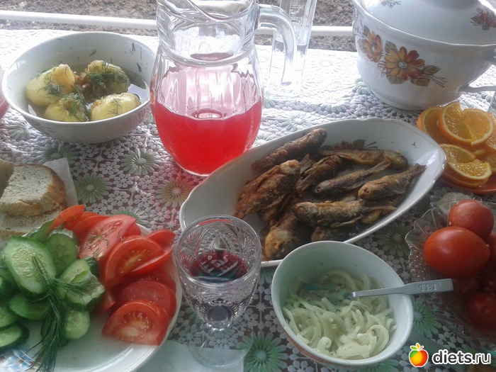 , рыбешка жареная, салатик с помидором и огурцом, вино сухое красное.