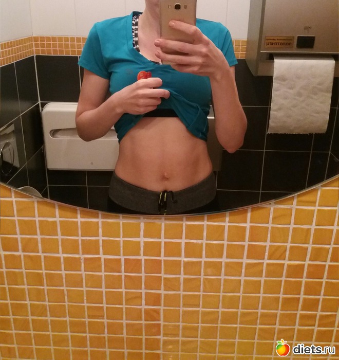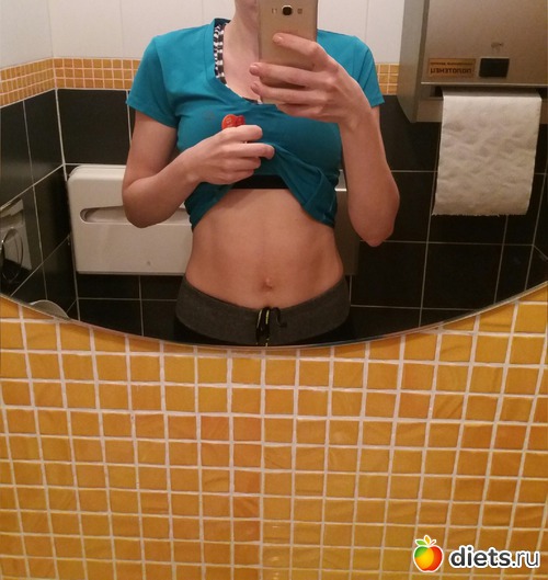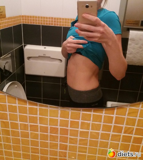 , а его всё нет и нет. Но надо признать: налипший за время беременности жир медленно, но уходит. Фотка из туалета в фитнес клубе (что поделать, освещение тут хорошее