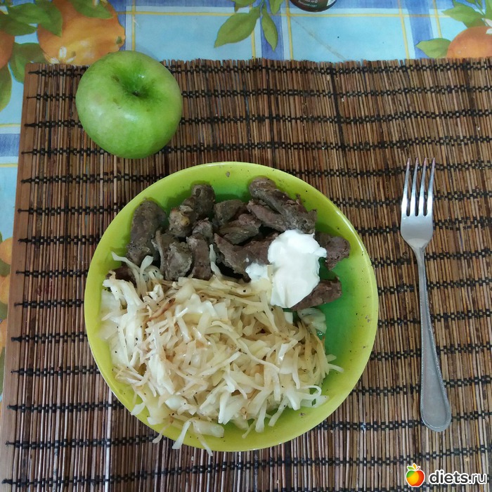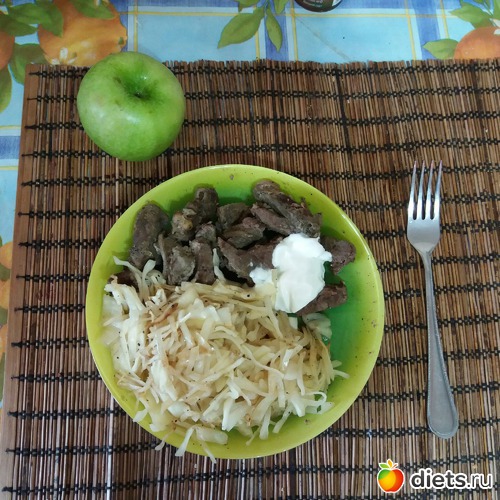 О: говяжья печень, тушеная капуста, сметана, яблоко