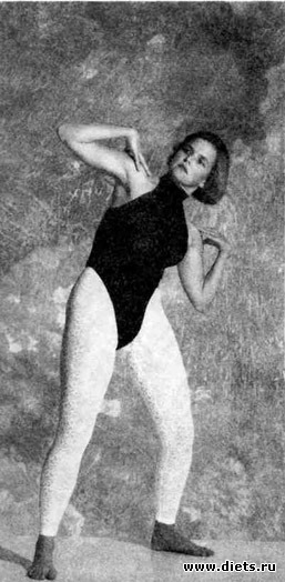 Для следующей растяжки поставьте ноги на ширину плеч и положите ладони на пол. Продержите эту растяжку до счета «тридцать». За это время ваши мускулы расслабятся и растяжка станет больше. Теперь, глядя на левое колено и положив правую руку на левую щиколотку, продержите эту растяжку до счета «тридцать». Левая рука в это время направлена вверх, и вытянута. Помните, что все время надо втягивать живот и напрягать квадрицепсы. Вы почувствуете, что растяжка становится сильнее, по мере того как вы отсчитываете до тридцати.