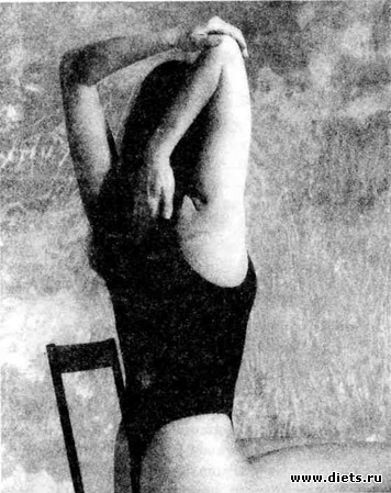 Сейчас мы как следует растянемся, начиная с рук. Поднимите правую руку, согните ее в локте и закиньте за спину, чтобы дотянуться до лопатки. Так, словно саму себя хотите похлопать по спине. Теперь левой рукой возьмитесь сверху за правый локоть и давите на него назад и вниз, только осторожно. Вы почувствуете растяжку задней поверхности плеча. Продержите руки в таком положении до счета «десять». Отпустите, поменяйте руки и растяните свою левую руку. Растягивайте мышцы медленно, чтобы не повредить их, почувствуйте границы безопасной зоны растяжения.