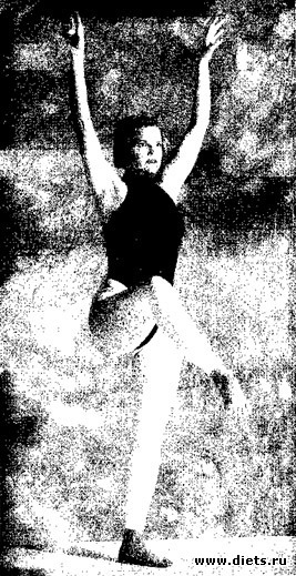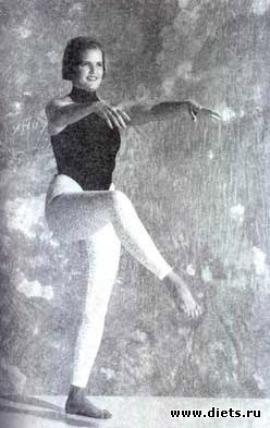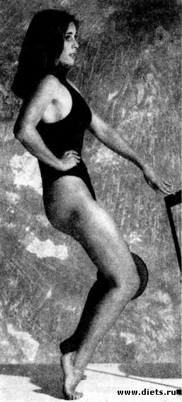 Поднимите ногу в два приема, потом так же, в два приема, опустите. Не поднимайте ногу выше, чем на уровень бедра, а когда вы опускаете ее, не касайтесь ею другой ноги. Не опускайте ногу совсем. Она должна постоянно пребывать в ровном и плавном движении: вверх-вверх, вниз-вниз. Выполните это движение пятьдесят раз. Все время проверяйте положение вашего колена: оно должно смотреть прямо на зеркало. В последнем подъеме задержите ногу до счета «десять», повернув колено вверх. Не давайте ноге опускаться и ни в коем случае не откидывайтесь назад: это напряжет поясницу и уничтожит все результаты вашей работы. Следите, чтобы не расслаблять зажим таза — он дает вам гарантию, что ягодицы станут круглыми и крепкими.