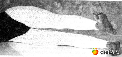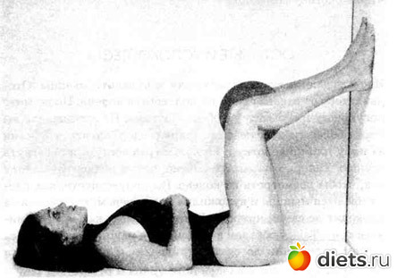 Зажав мяч между коленями, лягте на пол, поставив ступни ног на стену. Колени должны быть согнуты так, чтобы ягодицы оказались точно под коленями. Подожмите ягодицы и сожмите мяч. Задержите это положение до счета «три». Слегка отпустите мяч, потом снова сдавите его, считая до трех. Сделайте это пятнадцать раз, все время проверяя, не расслабили ли вы ягодичные мышцы. Постоянно следите, чтобы они от напряжения слегка поднимались кверху, крепко сжимайте их и мяч.