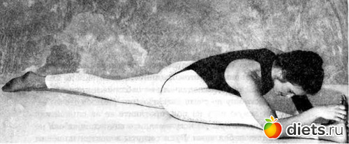 Опуская левую ногу на пол, протяните ее за спиной как можно дальше, а правую ногу вытяните вперед, пока она не ляжет на пол перед вами. Руки согнуты в локтях по обеим сторонам- вытянутой правой ноги. Постарайтесь приблизить лицо к колену и оставайтесь так, считая до десяти. Это по-настоящему растянет ваши подколенные сухожилия. Следите, чтобы никогда не пружинить в этой растяжке. Садитесь в нее медленно и держите ее крепко и ровно. Ваша гибкость постепенно будет увеличиваться на протяжении этой недели, и вам удастся сесть, наконец, на шпагат. Но даже если вы так и не сможете сесть на шпагат, вы будете растягивать подколенные сухожилия до самых ягодиц.