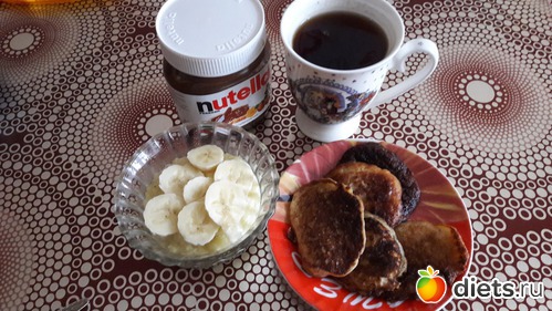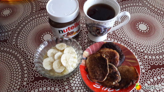 Завтрак - пшенная каша со сливочным маслом и бананом, оладушки с нутеллой + чай