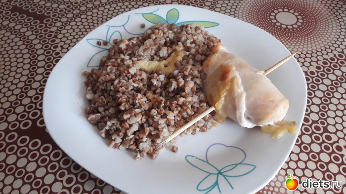 Обед - курица по-андалузски (рецепт из книги Е. Миримановой) + отварная гречка. Всего: 250г