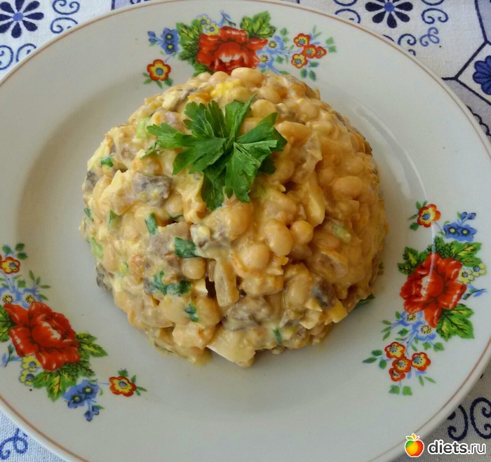 Обжарить лук с морковью и шампиньонами. Отварить фасоль, яйца. По количеству - на глаз. Всё смешать, добавить йогурт, зелень, соль. Очень сытный и белковый.