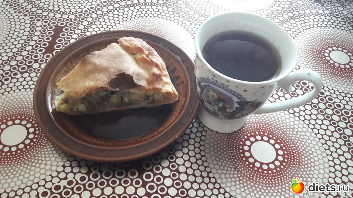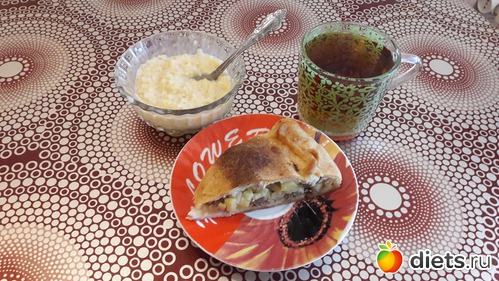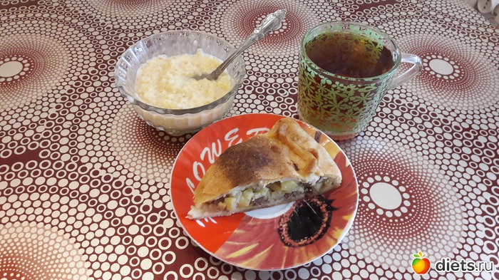 Завтрак - пирог с картофелем и мясом 104г, пшеничная каша со сливочным маслом 110г, 1 долька шоколадки + чай. Всего: 214г