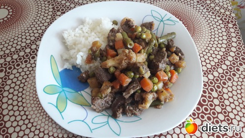 Обед - говядина тушеная с овощами + отварной рис. Всего: 252г