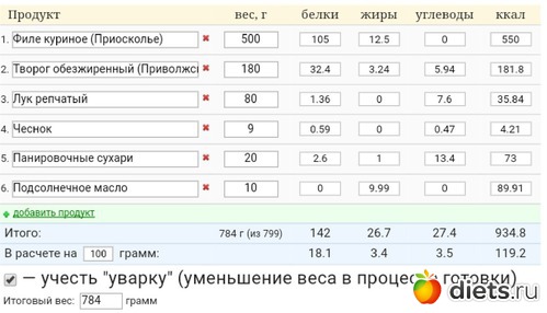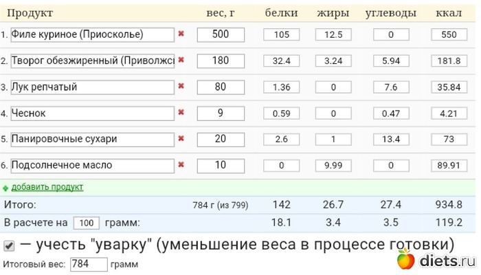 Поскольку я считаю калории, КБЖУ котлет с учетом ужарки (ужарились они не сильно, кстати):