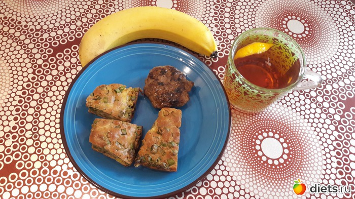 Завтрак - пирог с луком и яйцом, котлета говяжья, банан + чай