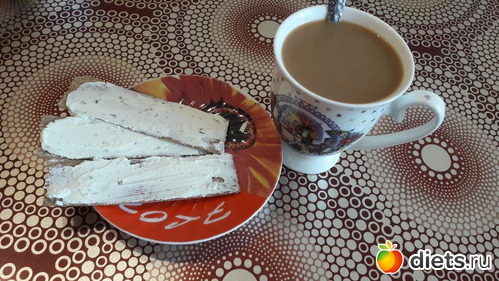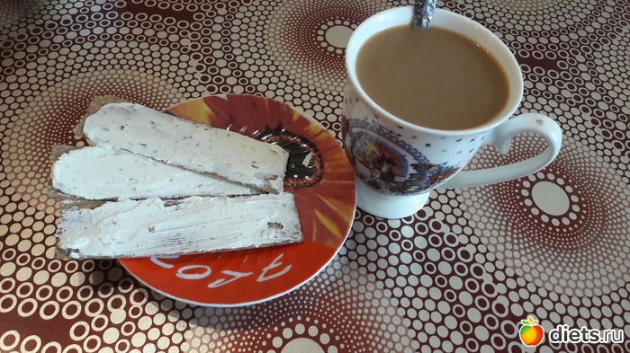 Перекус - три хлебца с творожным сыром + кофе с молоком