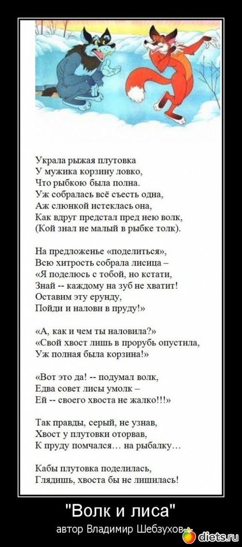 Останкин Женя 5 лет басня Владимира Шебзухова «Волк и лиса» Детсад №10 г. Тобольск 2015 Украла рыжая плутовка У мужика корзину ловко, Что рыбкою была полна. Уж собралась всё съесть одна, Аж слюнкой истеклась она, Как вдруг предстал пред нею волк, (Кой знал не малый в рыбке толк). На предложенье «поделиться», Всю хитрость собрала лисица:...