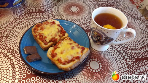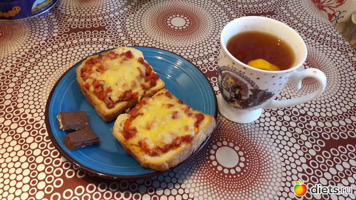 Завтрак - запеченные в духовке бутерброды 177г, две дольки шоколадки + чай