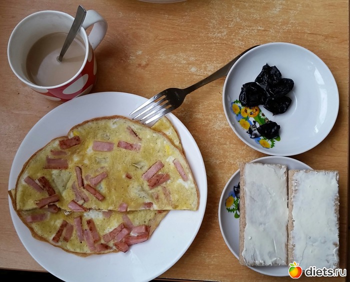 Яичница, хлебцы с плавл сыром, кофе сладкий, чернослив есть не стала