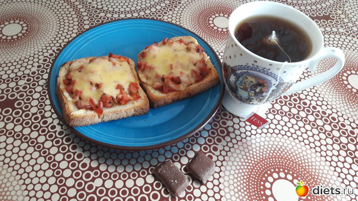 Завтрак - 2 бутерброда, запеченных в духовке 165г, 2 дольки шоколадки + чай