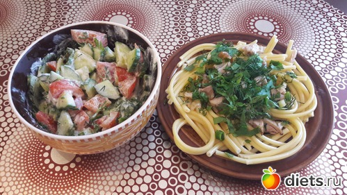 Обед - макароны с курицей 150г + салат из свежих овощей со сметаной 255г. Всего: 405г